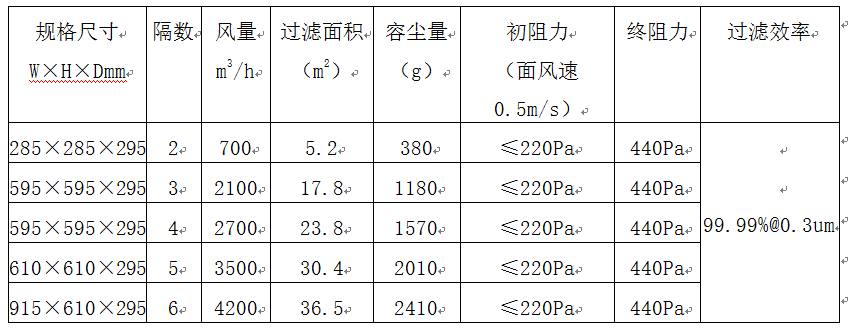 组合式高效过滤器标准技术参数: